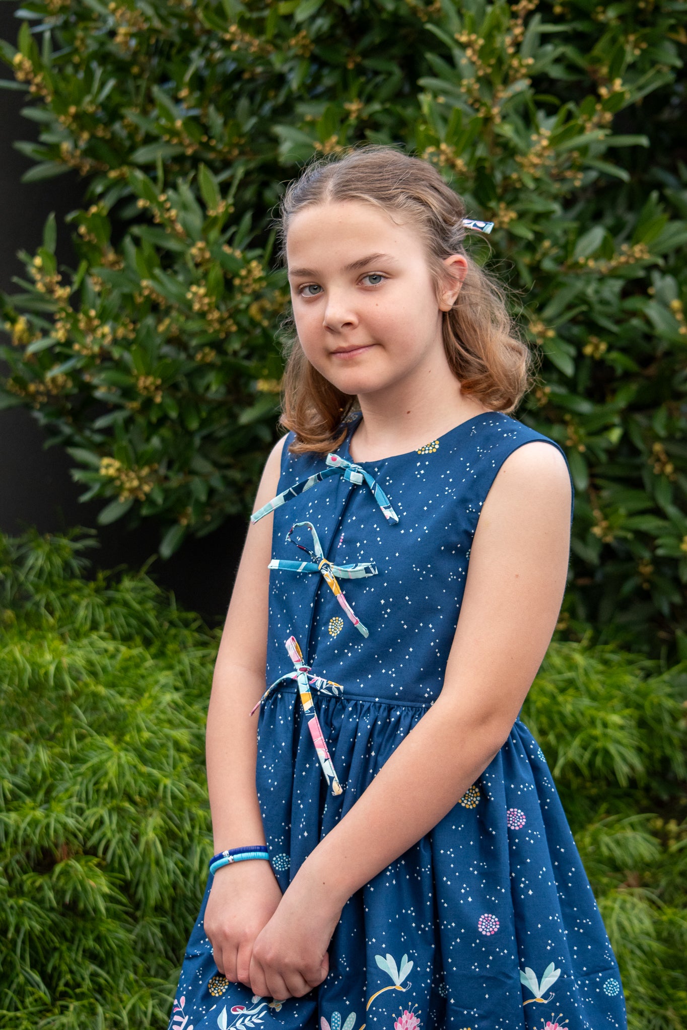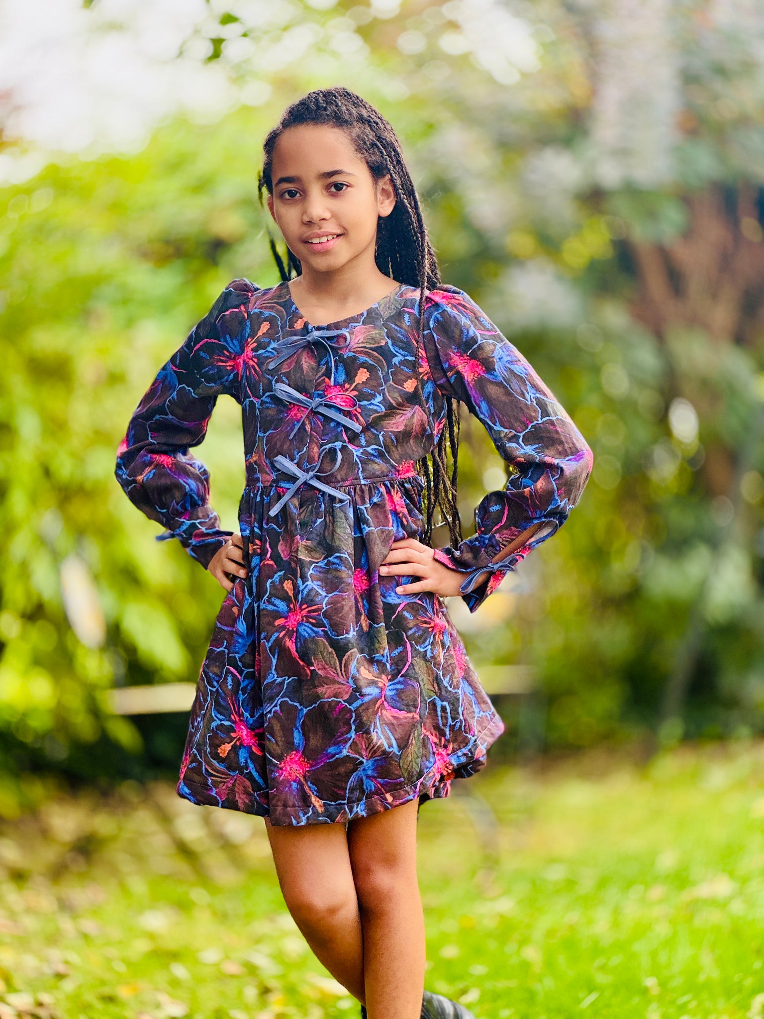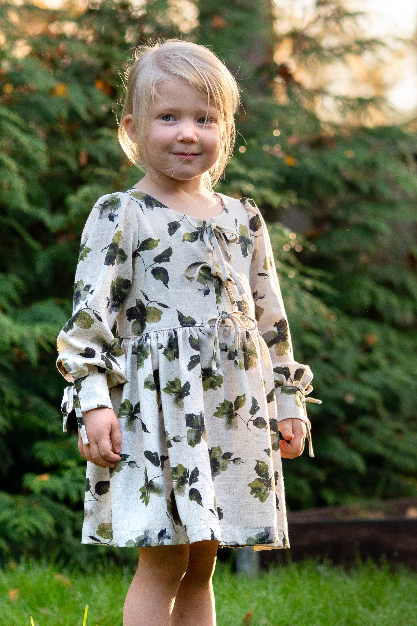 The Kiku Dress is a chic and versatile design, offered in both sleeveless and sleeved versions, making it perfect for year-round wear. Its standout feature is the modern front bow ties, adding a playful yet sophisticated touch. Behind the bows is a neatly constructed placket, ensuring modesty and comfortable coverage. The long sleeve option includes a charming tie detail at the cuff, giving the dress a refined finish.